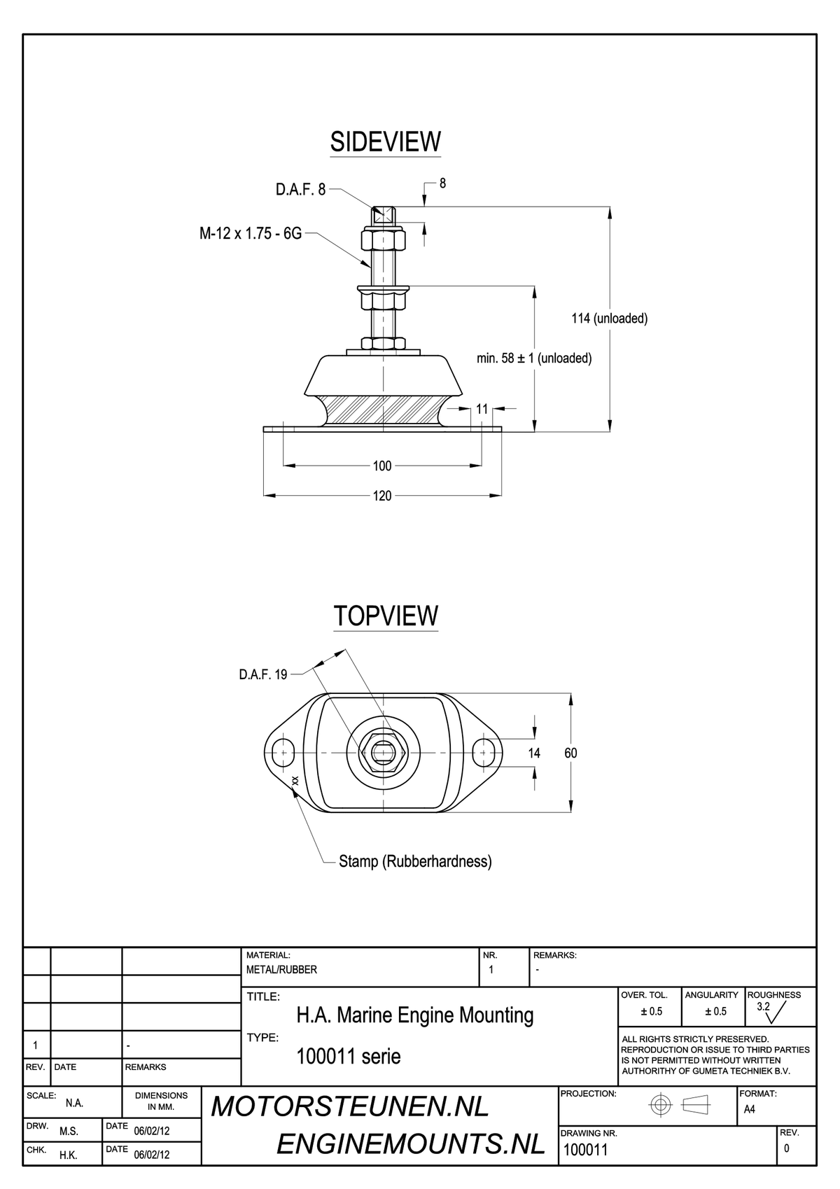 Marine Mounts zijn uitermate geschikt voor maritieme toepassingen. Deze compacte trillingsdempers zijn eenvoudig te monteren en bieden een hoge trillingsisolatie. De inwendige buffer zorgt ervoor dat de beweging van de motor in drie richtingen wordt begrensd. Marine Mounts zijn verkrijgbaar in vijf afmetingen en in diverse rubberhardheden. Dit type motorsteun is voorzien van een M12 stelstift voor de hoogte-instelling van de motor.